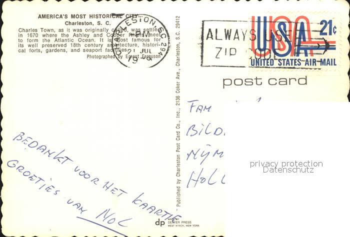 72434997 old postcard Charleston South Carolina Charles Town postalisch gelaufen Erhaltung siehe scans KatCode: 14140430000000