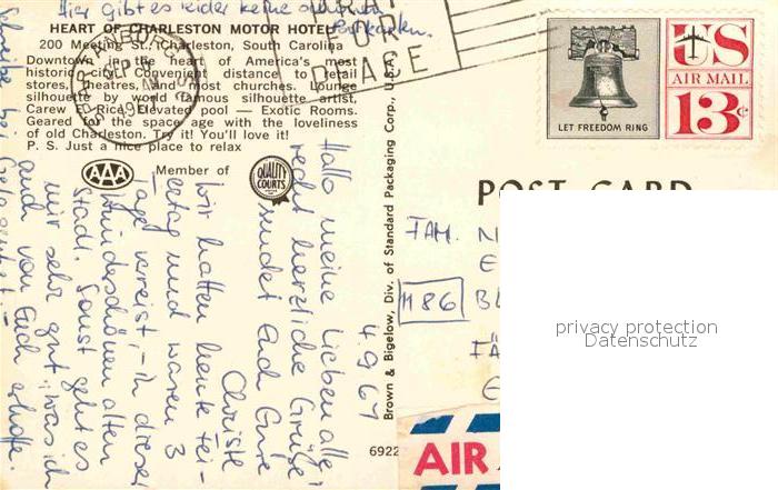 72662959 old postcard Charleston South Carolina Heart of Charleston Motor Hotel postalisch gelaufen Erhaltung siehe scans [WerneD78] KatCode: 14140430000000