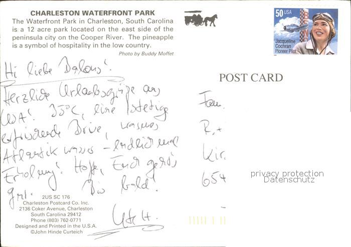 72434063 old postcard Charleston South Carolina Waterfront Park postalisch gelaufen Erhaltung siehe scans KatCode: 14140430000000