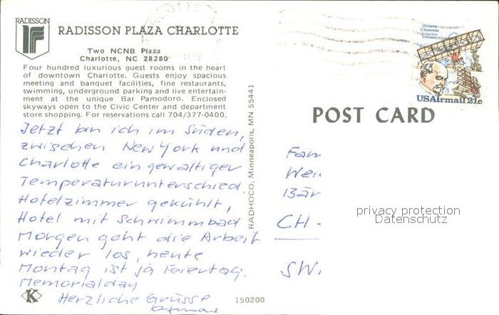 71953349 old postcard Charlotte North Carolina Radisson Plaza Charlotte postalisch gelaufen Erhaltung siehe scans KatCode: 14140350000000