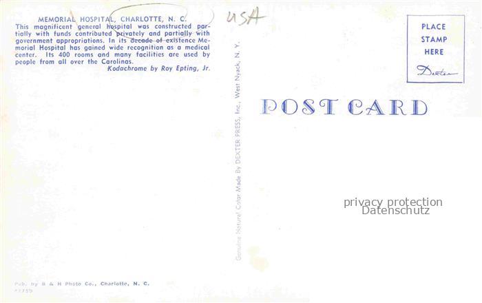 74011890 Charlotte North Carolina USA Memorial Hospital postalisch nicht gelaufen Erhaltung siehe scans [FriedD77] KatCode: 14140350000000