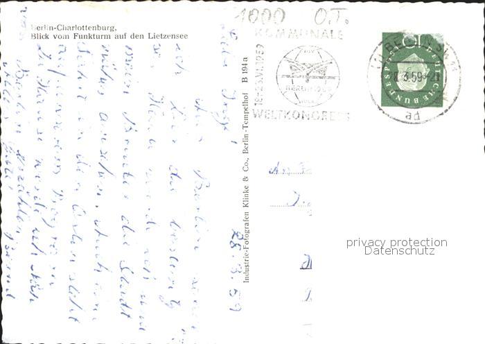 72092003 alte Postkarte Charlottenburg Blick vom Funkturm auf den Lietzensee postalisch gelaufen Erhaltung siehe scans KatCode: 11110011000000