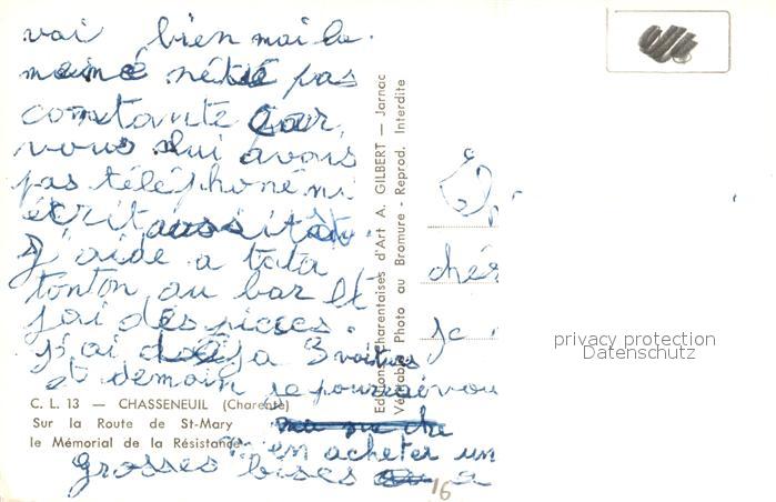 13493658 Chasseneuil-sur-Bonnieure Sur la Route de St Mary le Memorial de la Resistance postalisch nicht gelaufen Erhaltung siehe scans [WerneD78] KatCode: 11170016316085