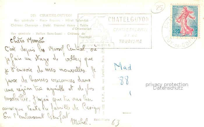 13523922 carte postale Chatelguyon Place Brosson Hôtel Splendid Chateau Etablissement Thermal Table d Orientation Vallon Sans Souci postalisch gelaufen Erhaltung siehe scans [FriedD77] KatCode: 11170063463103