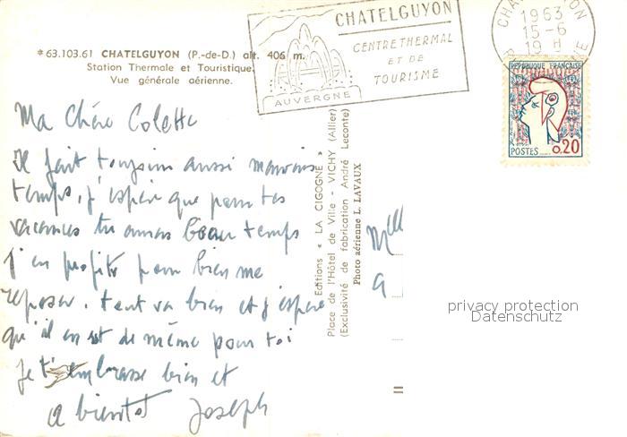 13576772 carte postale Chatelguyon Station Thermale et Touristique vue aérienne postalisch gelaufen Erhaltung siehe scans [FriedD77] KatCode: 11170063463103