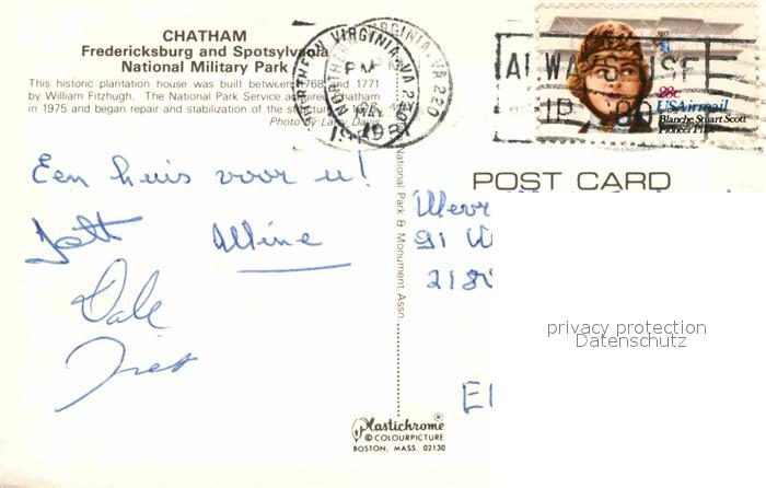 72897791 old postcard Chatham Virginia Fredericksburg and Spotsylvania National Military Park postalisch gelaufen Erhaltung siehe scans [FriedD77] KatCode: 14140490000000