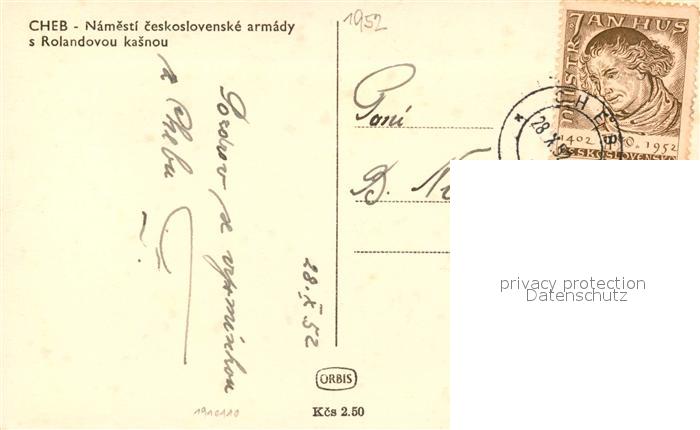 old postcard Cheb Eger Namesti ceskoslovenske armady s Rolandovou kasnou Platz Rolandstatue Brunnen postalisch gelaufen Erhaltung siehe scans [FriedD77]