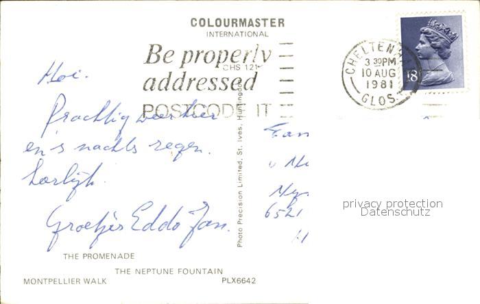 old postcard Cheltenham Promenade Neptune Fountain Montpellier Walk postalisch gelaufen Erhaltung siehe scans