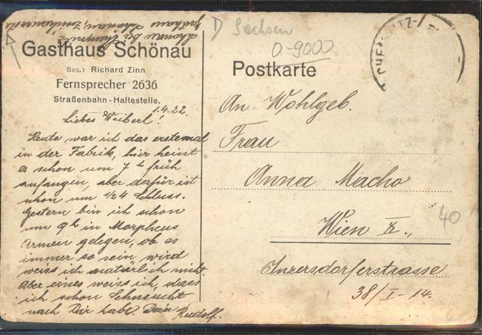 41313038 CHEMNITZ Sachsen Gasthaus Schoenau Zinn postalisch gelaufen Erhaltung mit Maengel Alte Ansichtskarte Postkarte alte Postkarte hz_L Katcode 11110014161000