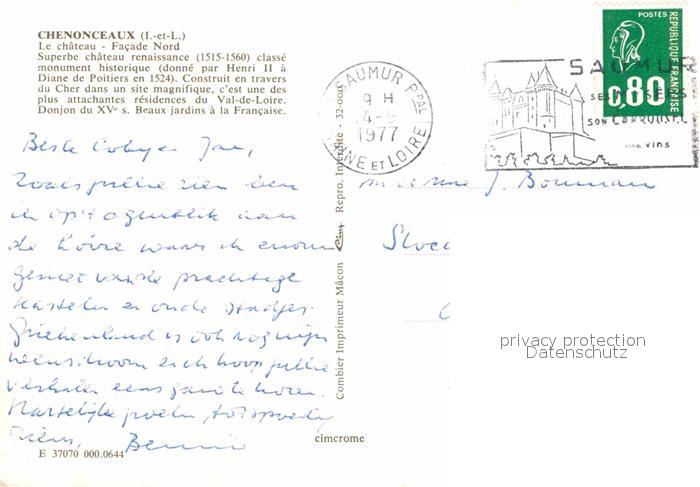 12899344 carte postale Chenonceaux Indre et Loire Chàteau Nordansicht postalisch gelaufen Erhaltung siehe scans [AndreD76] KatCode: 11170037237070