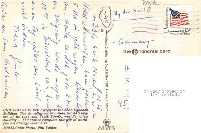 72803477 old postcard Chicago Illinois Skyline John Hancock Building Buckingham Fountain Skyscrapers postalisch gelaufen Erhaltung siehe scans [FriedD77] KatCode: 14140150000000