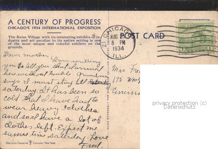 11498535 old postcard Chicago Illinois Swiss Village postalisch gelaufen Erhaltung siehe scans KatCode: 14140150000000