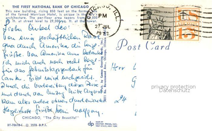 73762227 old postcard Chicago Illinois The First National Bank of Chicago postalisch gelaufen Erhaltung siehe scans [WerneD78] KatCode: 14140150000000