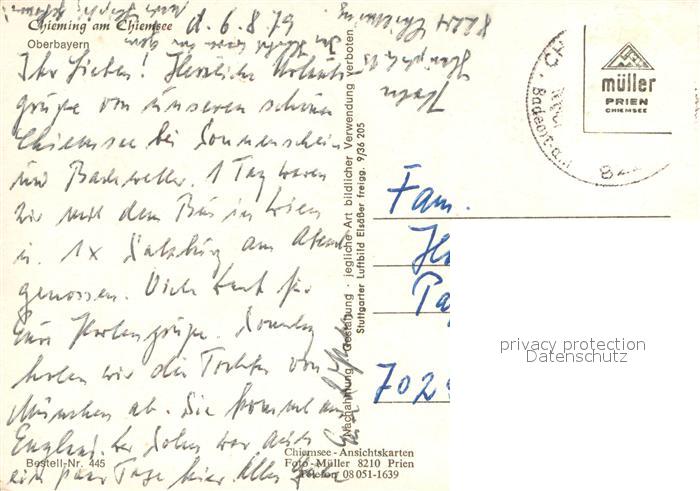 73683837 alte Postkarte Chieming Chiemsee Fliegeraufnahme postalisch gelaufen Erhaltung siehe scans [LiesaD40] KatCode: 11110009189114