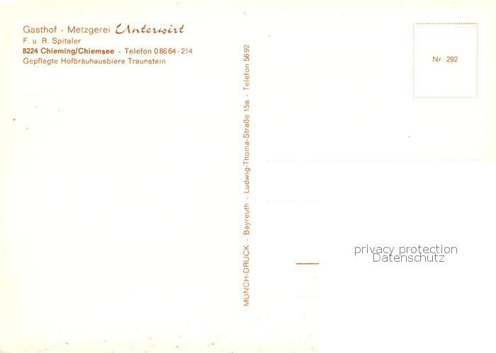 73846019 Chieming Chiemsee Gasthof Metzgerei Unterwirt Gaststube Terrasse postalisch nicht gelaufen Erhaltung siehe scans [FriedD77] KatCode: 11110009189114