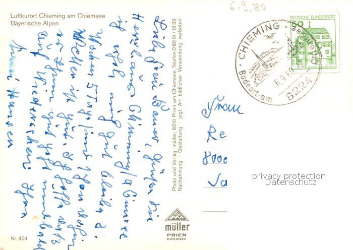 73149067 alte Postkarte Chieming Chiemsee Ortsmotiv mit Kirche Strandhotel Hallenbad Bootsanleger Segeln Chiemgauer Alpen postalisch gelaufen Erhaltung siehe scans [FriedD77] KatCode: 11110009189114