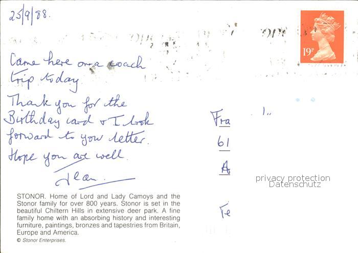 old postcard Chiltern Chiltern Stonor Home of Lord and Lady Camoys Chiltern Hills postalisch gelaufen Erhaltung siehe scans