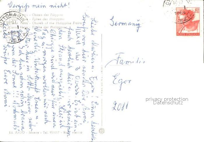 old postcard Chioggia Venetien Canal Vena Kirche Philippinor postalisch gelaufen Erhaltung siehe scans