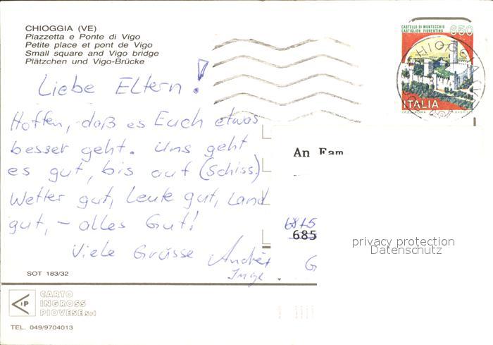 old postcard Chioggia Venetien Plaetzchen und Viogo Bruecke postalisch gelaufen Erhaltung siehe scans