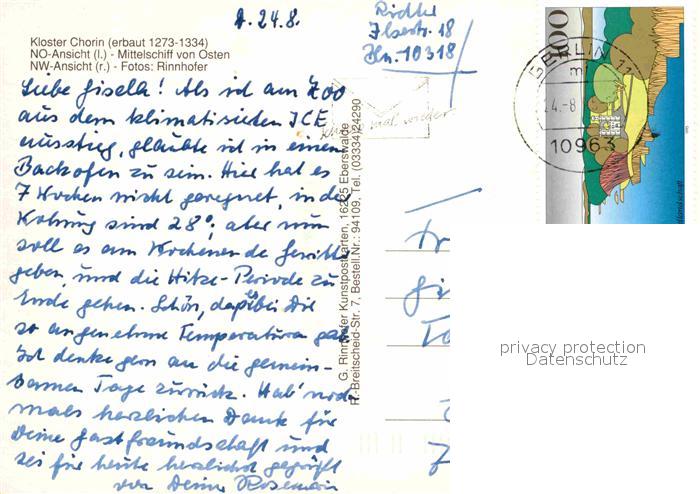 72705771 alte Postkarte Chorin Kloster postalisch gelaufen Erhaltung siehe scans [AndreD76] KatCode: 11110012060045