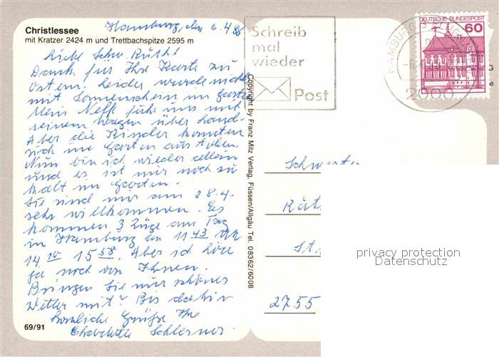 72721030 alte Postkarte Christlessee Berggasthaus mit Kratzer und Trettbachspitze Allgaeuer Alpen postalisch gelaufen Erhaltung siehe scans [FriedD77] KatCode: 11110009780133