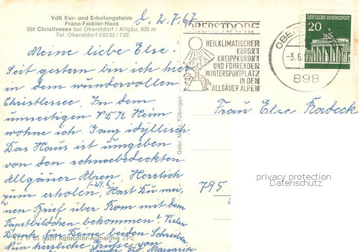 73125084 alte Postkarte Christlessee VdK Kur- und Erholungsheim Franz-Fackler-Haus postalisch gelaufen Erhaltung siehe scans [PaolaD17] KatCode: 11110009780133