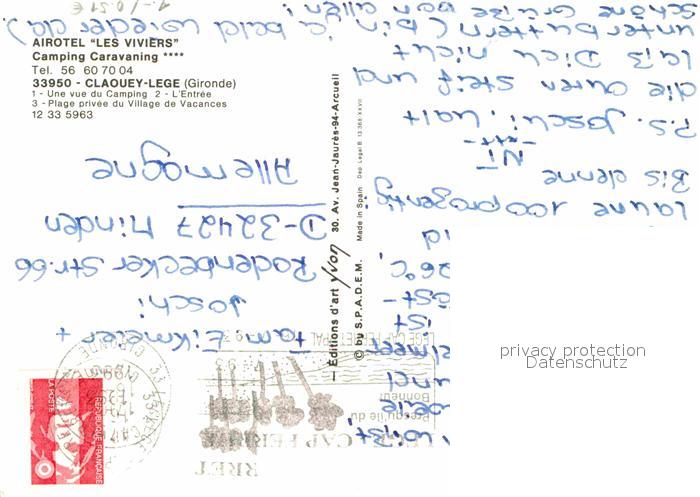 12674712 Claouey Airhotel Les Viviers Camping Plage privee du Village de Vacances postalisch nicht gelaufen Erhaltung siehe scans [WerneD78] KatCode: 11170033633236