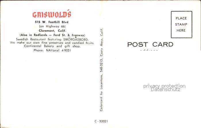 72167487 Claremont California Griswolds Restaurant postalisch nicht gelaufen Erhaltung siehe scans KatCode: 14140050000000