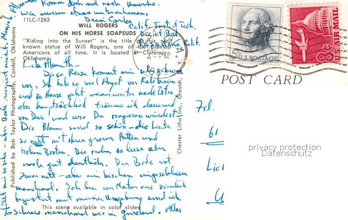 72706065 old postcard Claremore Will Rogers on his horse Soapsuds Monument postalisch gelaufen Erhaltung siehe scans [FriedD77] KatCode: 14140380000000