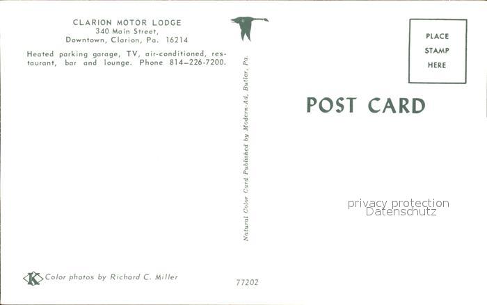 11688366 Clarion Pennsylvania Motor Lodge postalisch nicht gelaufen Erhaltung siehe scans KatCode: 14140410000000