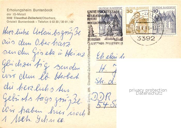 73071233 alte Postkarte Clausthal-Zellerfeld Erholungsheim Buntenbock der IG Metall Fliegeraufnahme postalisch gelaufen Erhaltung siehe scans [FriedD77] KatCode: 11110003153004