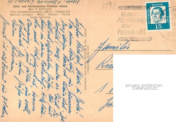 43352558 Clausthal-Zellerfeld Goslar Niedersachsen Gast und Pensionshaus Pixhaider Muehle postalisch nicht gelaufen Erhaltung siehe scans [WerneD78] Wern Katcode 11110003153004