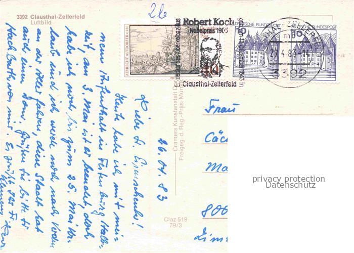 74157656 alte Postkarte Clausthal-Zellerfeld Goslar Niedersachsen Harz Stadtansicht Dachlandschaft Felder Berge Fachwerkhaus postalisch gelaufen Fliegeraufnahme Erhaltung siehe scans [Karloger] KatCode: 11110003153004