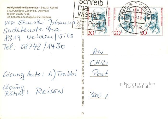 73841323 Clausthal-Zellerfeld Goslar Niedersachsen Waldgaststaette Dammhaus postalisch gelaufen Erhaltung siehe scans [WerneD78] alte Postkarte Wern Katcode 11110003153004