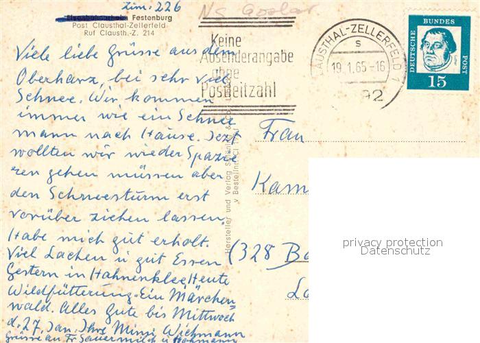 72888326 alte Postkarte Clausthal-Zellerfeld Hotel Restaurant Festenburg postalisch gelaufen Erhaltung siehe scans [FriedD77] KatCode: 11110003153004