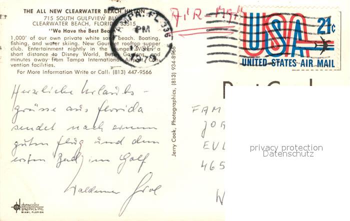 73097744 old postcard Clearwater Beach Hotel Hilton postalisch gelaufen Erhaltung siehe scans [KathaD81] KatCode: 14140110000000