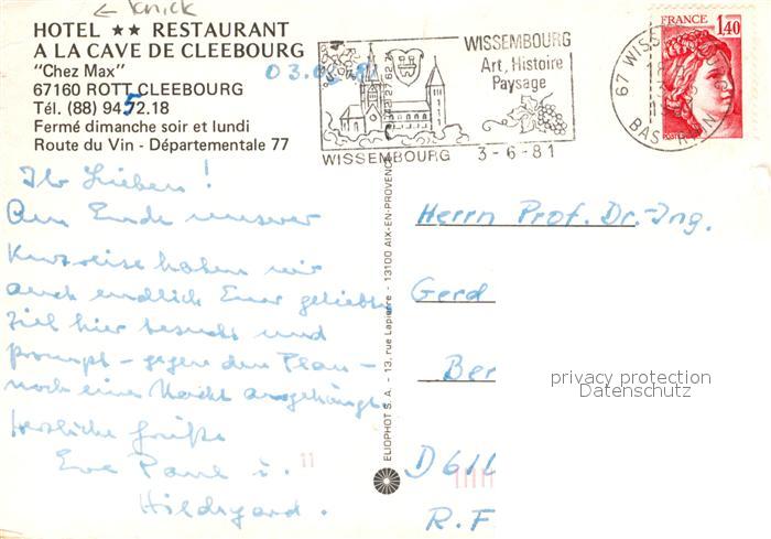 13355418 carte postale Cleebourg Hotel Restaurant a la Cave de Cleebourg postalisch gelaufen Erhaltung siehe scans [FriedD77] KatCode: 11170067767074