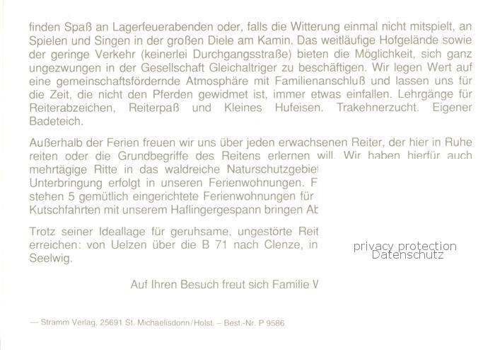 73754848 Clenze Reiterhof Seelwig Kutsche Reithalle Pferdeweide postalisch nicht gelaufen Werbekarte (keine Postkarte) Erhaltung siehe scans [WerneD78] KatCode: 11110003354002