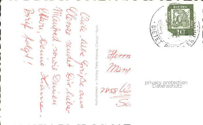 32148961 alte Postkarte Clenze Schwimmbad Rathaus Post Sparkasse postalisch gelaufen Erhaltung siehe scans KatCode: 11110003354002