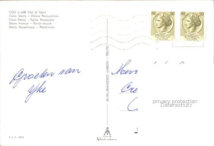 old postcard Cles Corso Dante Chiesa Parrocchiale Hauptstrasse Pfarrkirche postalisch gelaufen Erhaltung siehe scans