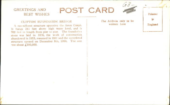 11474547 Clifton Supsension Bridge postalisch nicht gelaufen Erhaltung siehe scans KatCode: 11570