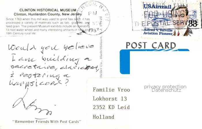 72856127 old postcard Clinton New Jersey Clinton Historical Museum postalisch gelaufen Erhaltung siehe scans [NatalD47] KatCode: 14140320000000