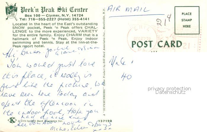 73061583 old postcard Clymer New York Peekn Peak Ski Center postalisch gelaufen Erhaltung siehe scans [WerneD78] KatCode: 14140340000000