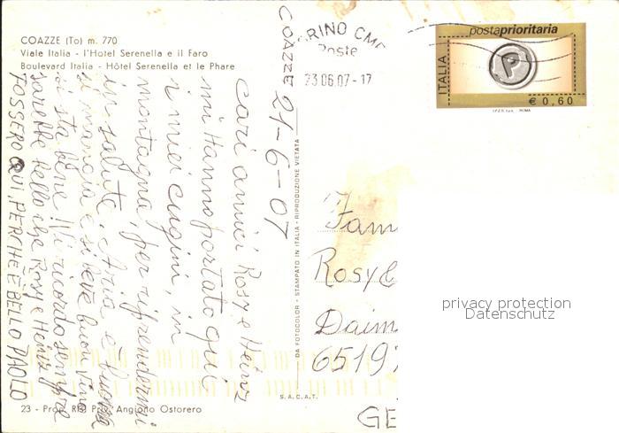 old postcard Coazze Viale Italia Hotel Serenella Faro Boulevard Italia postalisch gelaufen Erhaltung siehe scans