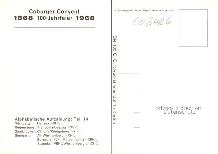 73864754 Coburg Bayern Coburger Confent XIV. Farbentafel der Korporationen 100-Jahrfeier postalisch nicht gelaufen Erhaltung siehe scans [FriedD77] Frie Katcode 11110009463000