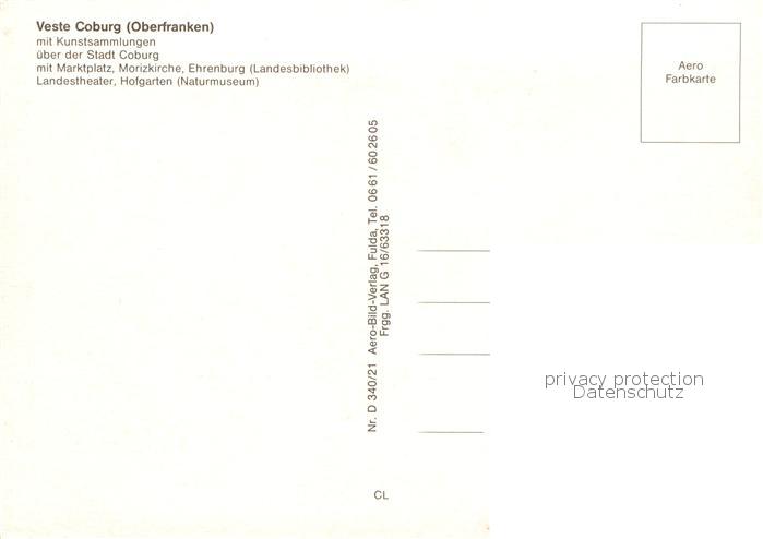 73841326 Coburg Bayern Fliegeraufnahme mit Veste Coburg Stadt Marktplatz Morizkirche Ehrenburg Landestheater Hofgarten postalisch nicht gelaufen Erhaltung siehe scans [WerneD78] Wern Katcode 11110009463000