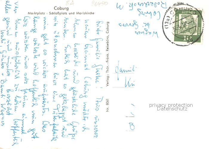 73647222 Coburg Bayern Marktplatz Schlossplatz und Morizkirche Fliegeraufnahme postalisch gelaufen Erhaltung siehe scans [FriedD77] alte Postkarte Frie Katcode 11110009463000