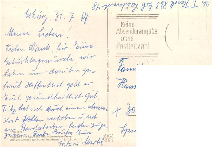 73906117 Coburg Bayern Neugasse mit Rueckseite des Muenzmeisterhauses postalisch gelaufen Erhaltung siehe scans [WerneD78] alte Postkarte Wern Katcode 11110009463000