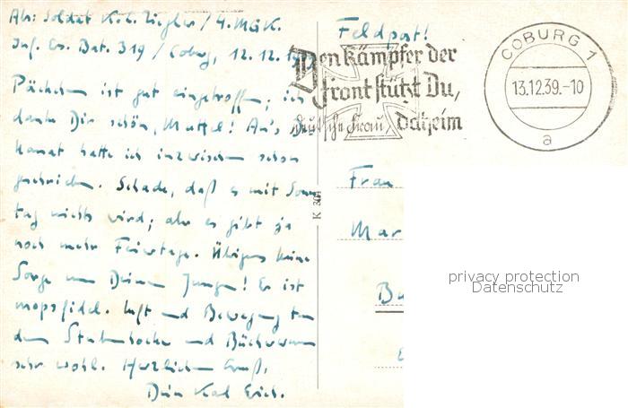 73779597 Coburg Bayern Stadtpanorama mit Kirche und Veste Feldpost postalisch gelaufen Erhaltung siehe scans [FriedD77] alte Postkarte Frie Katcode 11110009463000