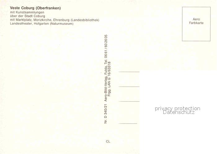 72831889 Coburg mit Veste Marktplatz Morizkirche Ehrenburg Landestheater Hofgarten Naturmuseum Fliegeraufnahme postalisch nicht gelaufen Erhaltung siehe scans [FriedD77] KatCode: 11110009463000
